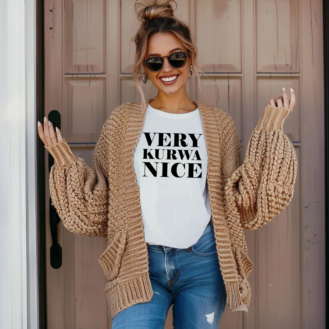 Masz poczucie humoru i lubisz wyróżniać się z tłumu? Nasza śmieszna koszulka damska z nadrukiem „very kurwa nice” to doskonały wybór dla wszystkich dziewczyn, które uwielbiają oryginalne stylizacje i chcą dodać swoim outfitom odrobinę luzu i uśmiechu! Dzięki różnorodnym wzorom, zabawnym hasłom i motywom inspirowanym codziennym życiem, znajdziesz model, który idealnie odda Twój charakter. Nasze t-shirty to połączenie wygody, trwałości i oryginalnych wzorów. Koszulka została wykonana z wysokiej jakości 100% bawełny, dzięki czemu jest przewiewna, komfortowa i wytrzymała. Nadruk wykonujemy niezniszczalną metodą, która zapewnia odporność na wielokrotne pranie. Niezależnie od tego, czy jesteś miłośniczką ironii, masz cięty język jak Mała Mi, czy po prostu lubisz nosić rzeczy, które rozśmieszają innych – znajdziesz u nas idealną koszulkę dla siebie!
