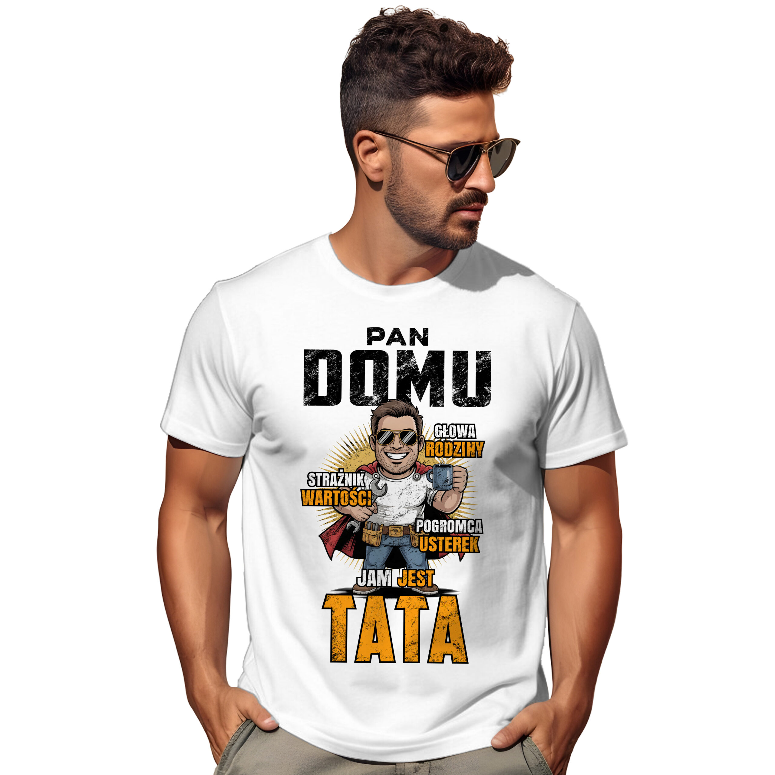 Koszulka z nadrukiem „Pan domu, głowa rodziny, strażnik wartości, pogromca usterek – jam jest TATA” – dla ojca, który ogarnia wszystko i wszystkich! ✨