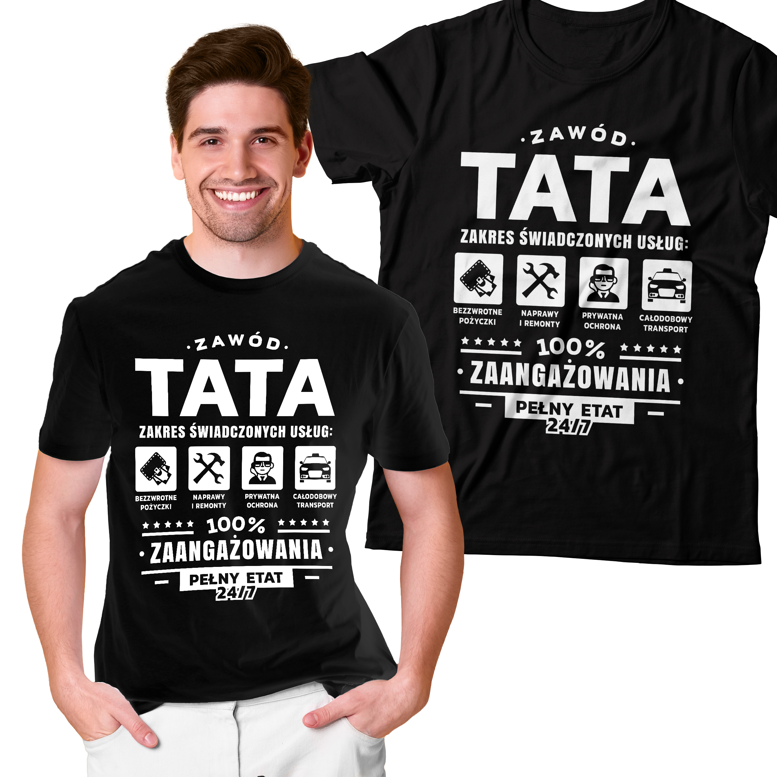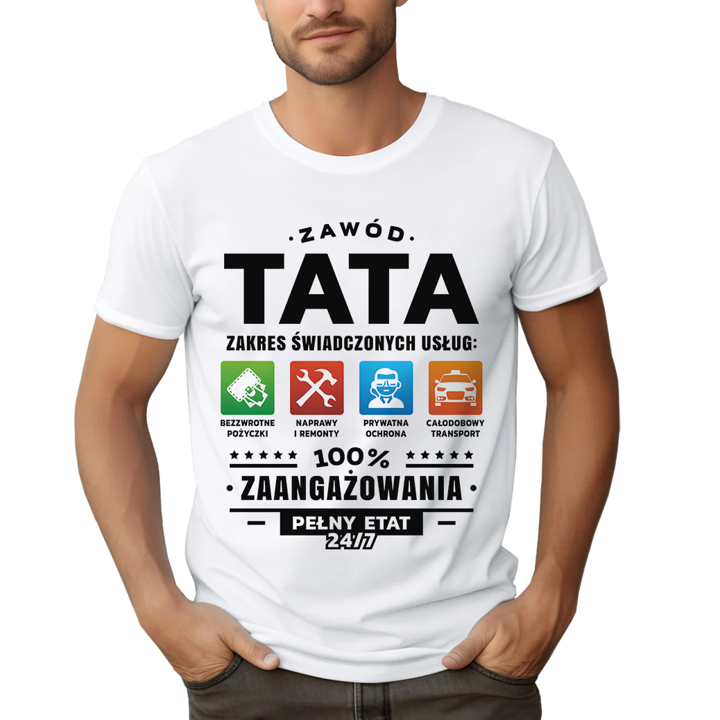 ⭐ KOSZULKA ZAWÓD TATA ZAKRES ŚWIADCZONYCH USŁUG BEZZWROTNE POŻYCZKI NAPRAWY I REMONTY PRYWATNA OCHRONA CAŁODOBOWY TRANSPORT 100% ZAANGAŻOWANIA PEŁNY ETAT 24/7
