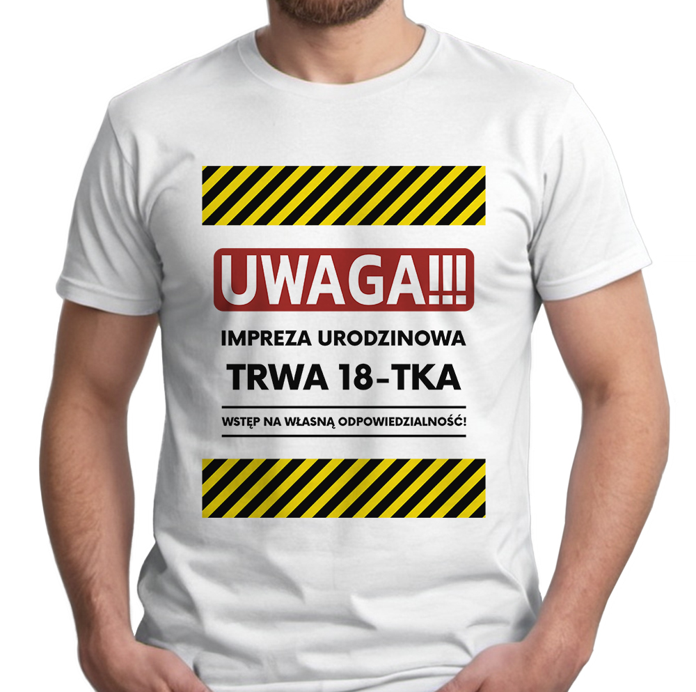 ⭐ KOSZULKA UWAGA IMPREZA URODZINOWA TRWA 18-TKA WSTĘP NA WŁASNĄ ODPOWIEDZIALNOŚĆ