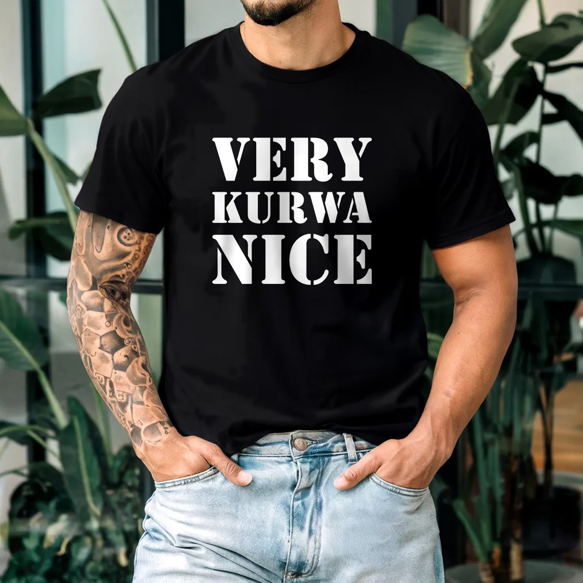 Szukasz oryginalnej koszulki, która przyciągnie spojrzenia i wywoła uśmiech na twarzach innych? Nasza śmieszna koszulka z nadrukiem „VERY KUR*A NICE” (mały napis) to idealny wybór dla osób z dystansem do siebie i świetnym poczuciem humoru! Niezależnie od tego, czy chcesz rozbawić znajomych, wyróżnić się w tłumie, czy po prostu dodać odrobinę luzu do swojej garderoby – nasz t-shirt zrobi to za Ciebie! Koszulka została wykonana z wysokiej jakości 100% bawełny, dzięki czemu jest przewiewna, komfortowa i trwała. Nadruk wykonujemy niezniszczalną metodą, która zapewnia odporność na wielokrotne pranie.